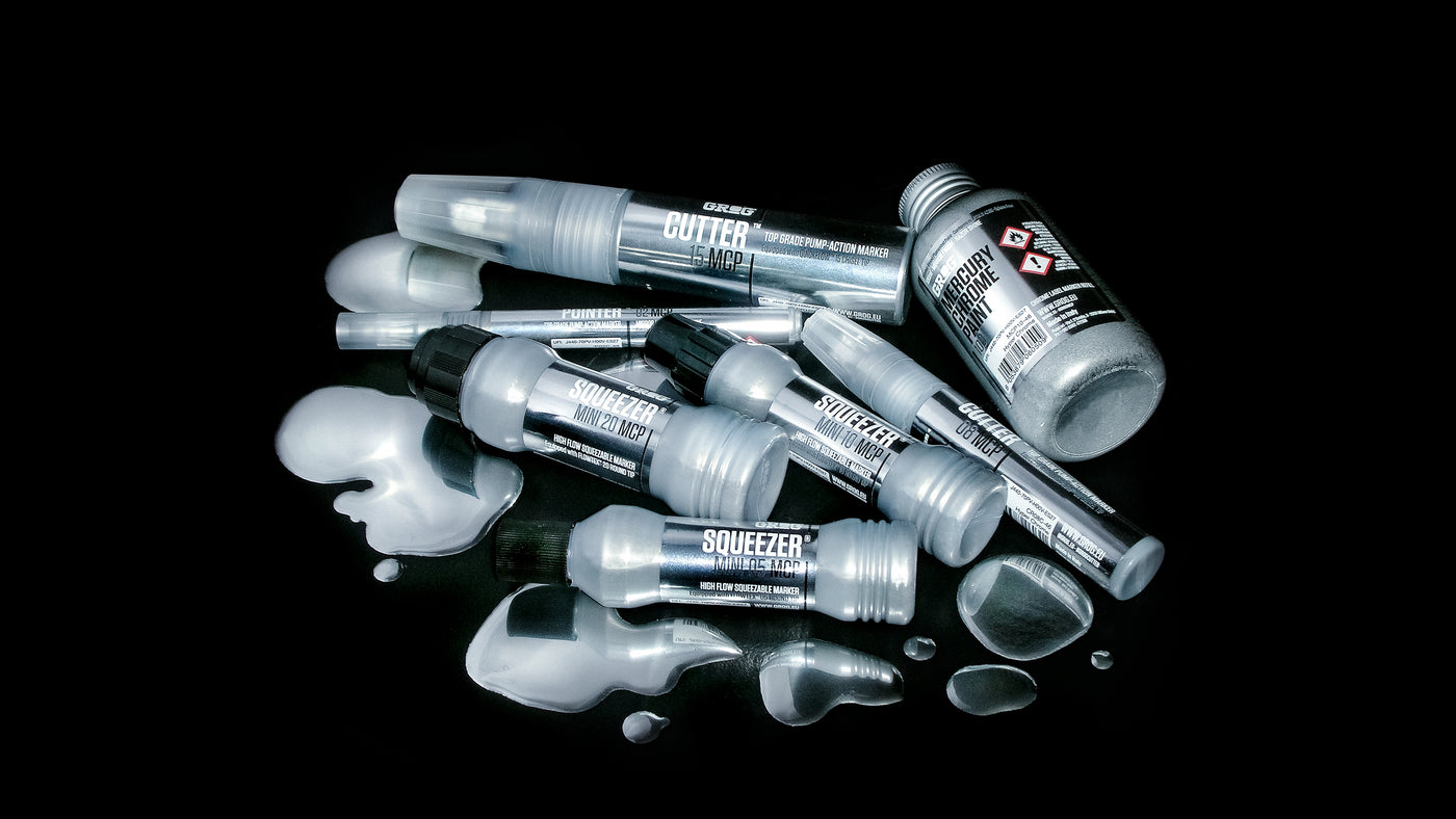 The line rolls out with seven weapons: Cutter™ 08 MCP, Cutter™ 15 MCP, Pointer™ 02 MCP, and three sizes of Squeezer® Mini MCP— 5, 10, and 20 mm. All preloaded with Mercury Chrome Paint™, a high-density, alcohol-based formula optimized for full-blast mirror reflection. Paired with MCP™ 100 refill, you’ve got everything you need to reload, remix, and hit again.